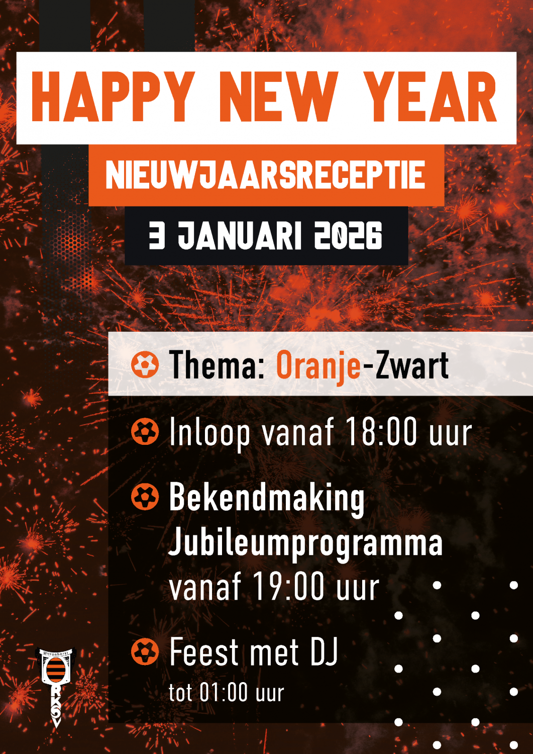 Op zaterdag 3 januari luiden we het nieuwe jaar feestelijk in tijdens de nieuwjaarsreceptie in de kantine, volledig in het thema oranje/zwart. Vanaf 18:00 uur ben je van harte welkom voor de inloop: een mooi moment om bij te praten, te proosten en samen het nieuwe jaar goed te beginnen!