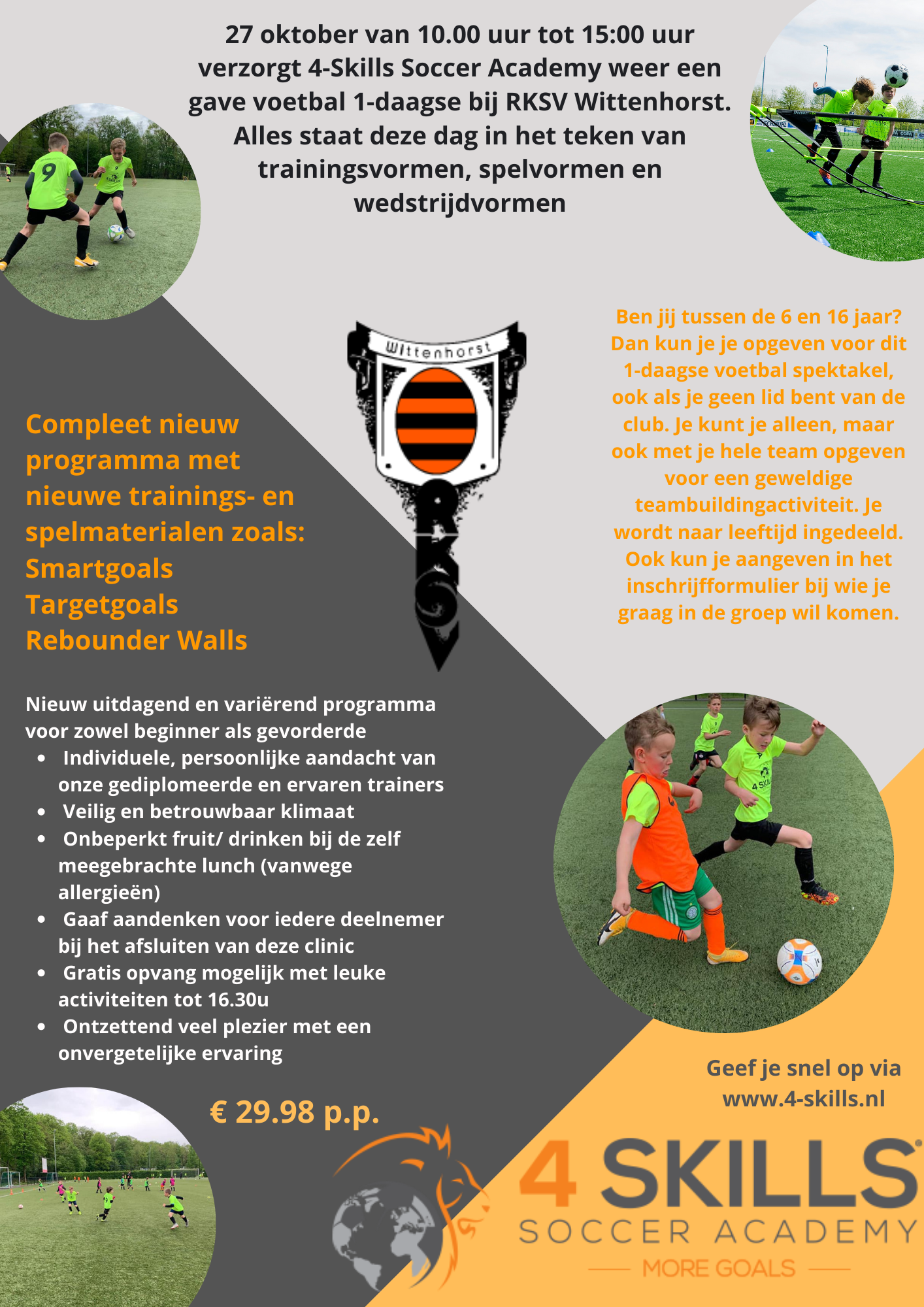 Woensdag 27 oktober van 10.00 tot 15.00 uur verzorgt 4-Skills Soccer Academy weer een gave voetbal 1-daagse bij RKsv Wittenhorst. Alles staat deze dag in het teken van trainingsvormen, spelvormen en wedstrijdvormen. Voor meer informatie zie de flyer in de bijlage.