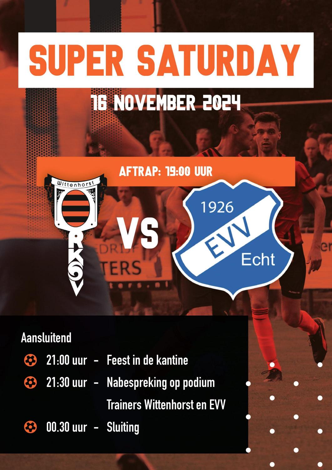 Aankomende zaterdag 16 november 2024 vindt Super Saturday plaats. Tijdens dit evenement is iedereen van harte welkom om Wittenhorst te komen aanmoedigen, en om een leuk feest te komen bouwen in onze kantine.