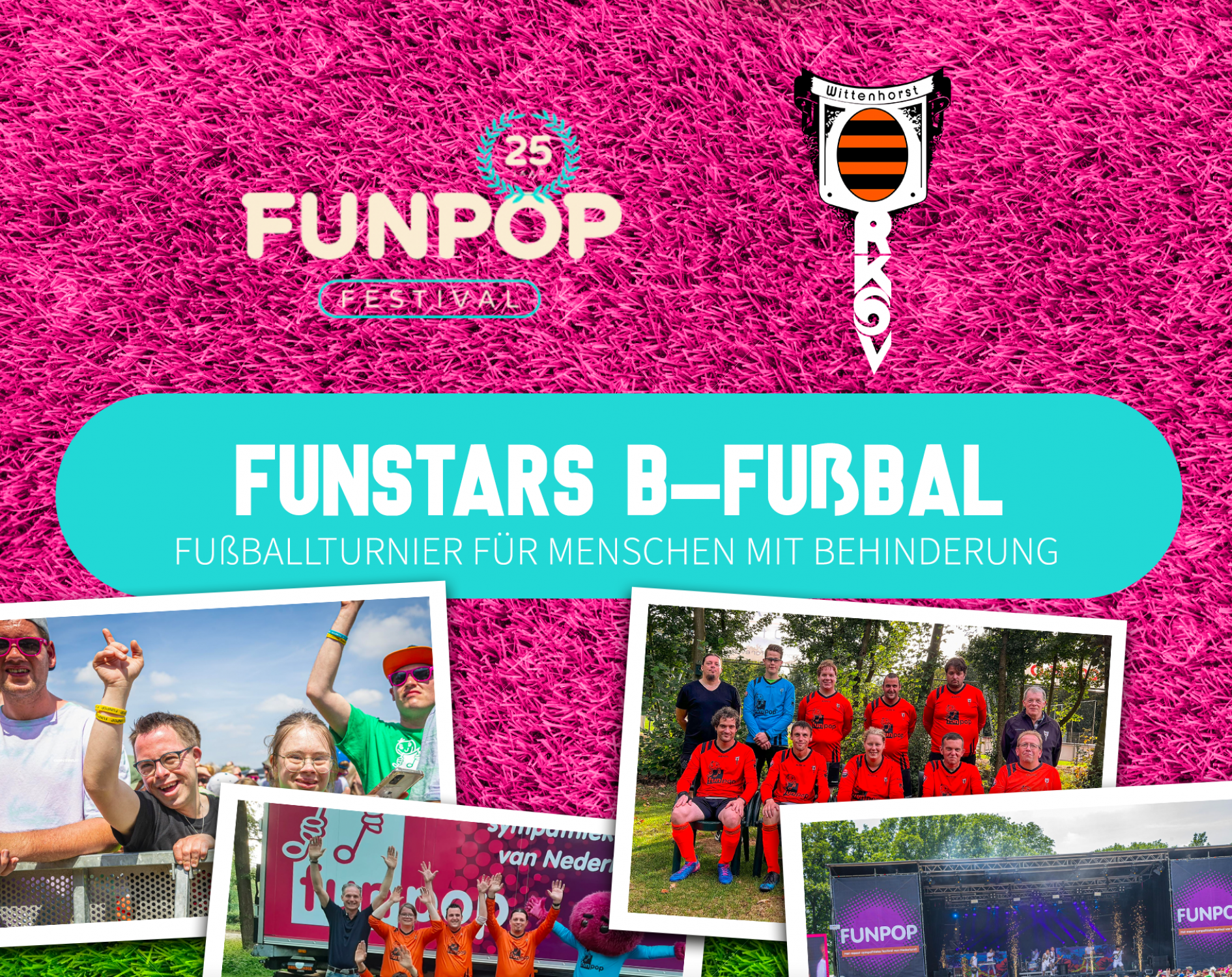 Das Musikfestival Funpop und der RKsv Wittenhorst veranstalten am Samstagvormittag, den 13. Mai 2023, gemeinsam das kostenlose 8-gegen-8 Funstars B-Fußball für Menschen mit Behinderung. Die Siegerehrung des Fußballturniers für G-Mannschaften findet anschließend auf dem Funpop-Festival statt. Eine großartige Kombination aus Sport und Musik. Wenn Sie mit Ihrem B-Team teilnehmen, besuchen Sie Funpop sogar mit einem zusätzlichen Rabatt.