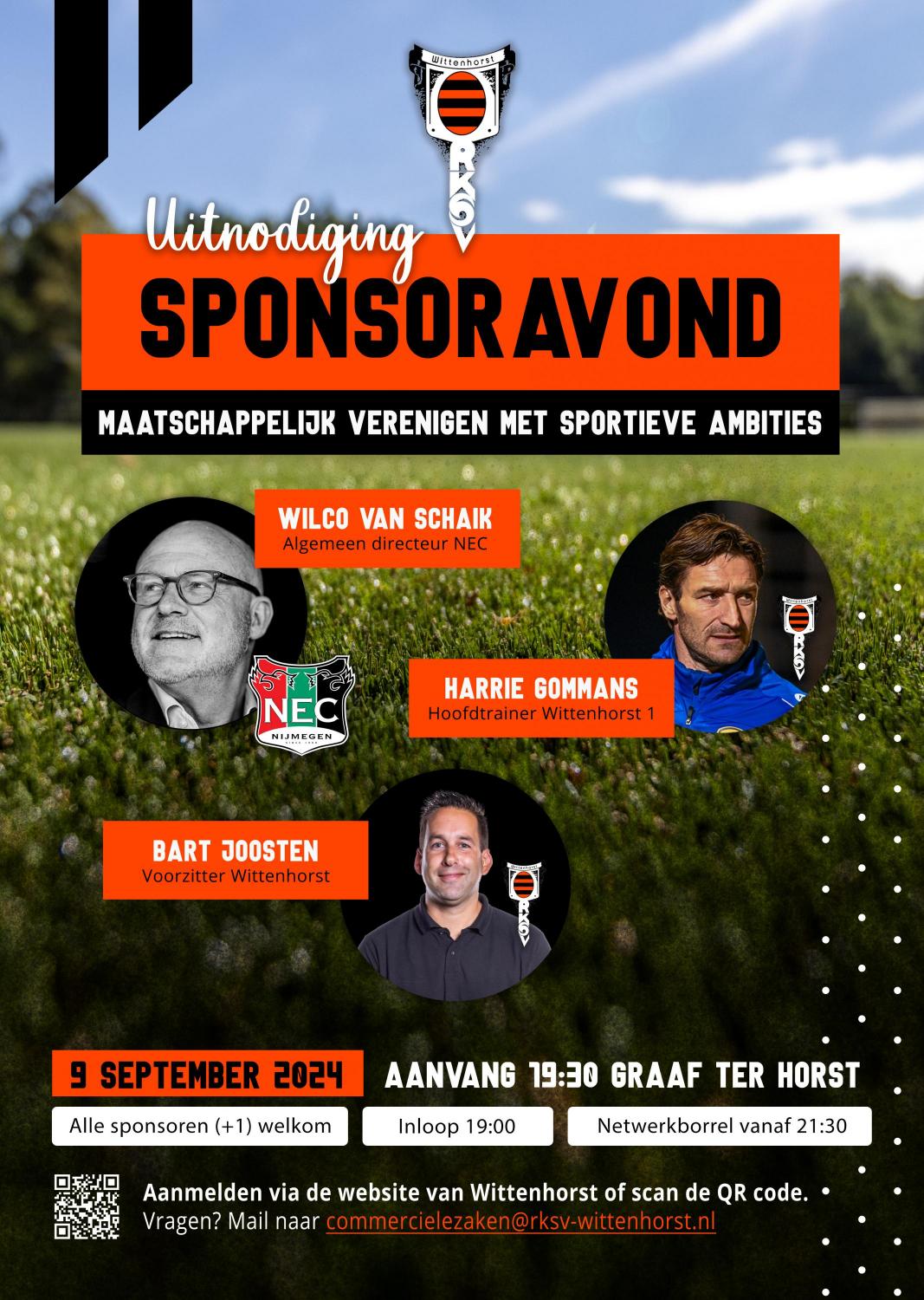 Graag nodigen wij alle sponsoren inclusief introducé/partner van Wittenhorst uit voor de jaarlijkse Sponsoravond die zal plaatsvinden op maandag 9 september in het sfeervolle Graaf ter Horst. Een avond die in het teken staat van verbinding, inspiratie en de kracht van ons sportieve netwerk. Met enkele topsprekers.