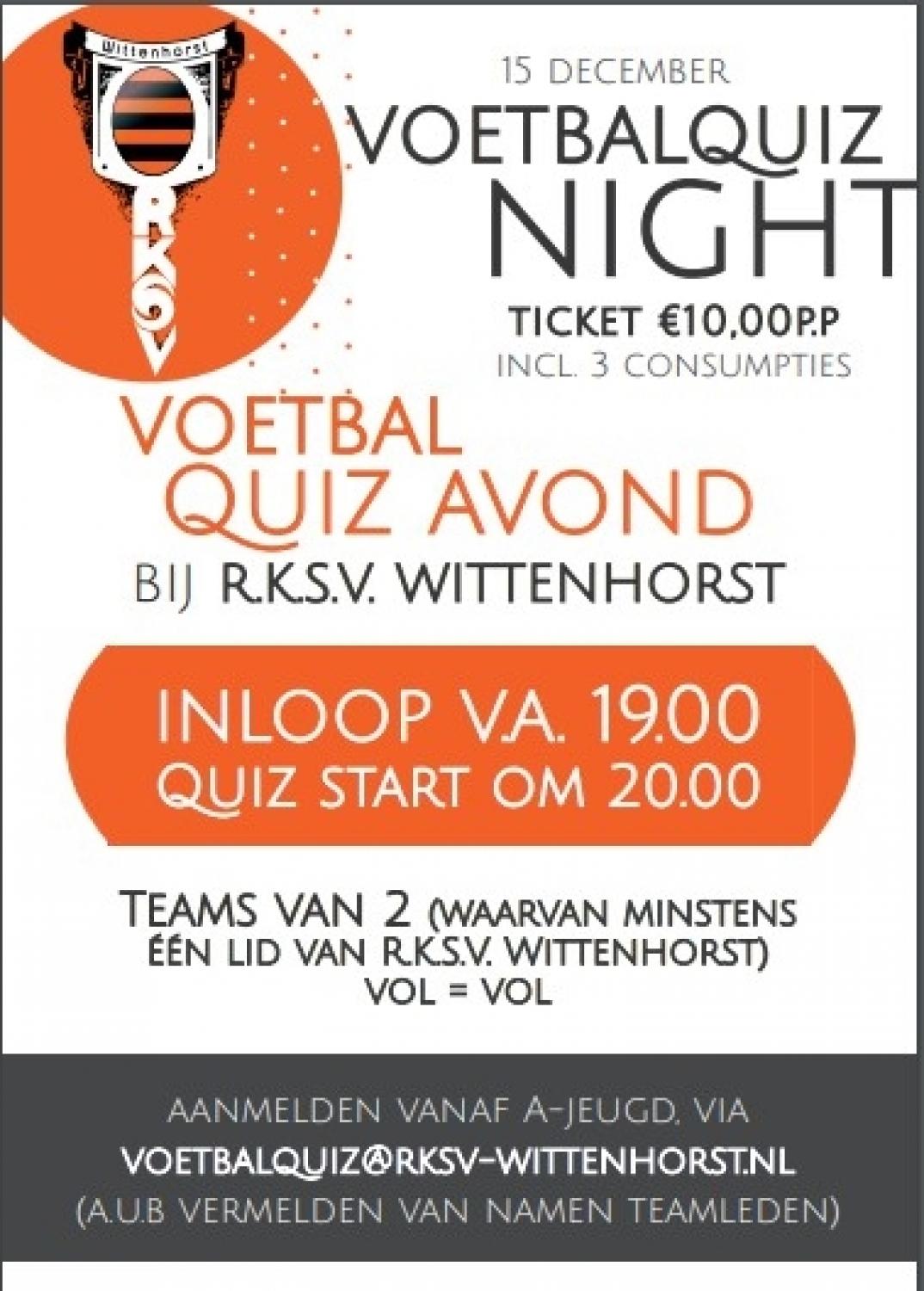 De aanmeldingen voor de allereerste 'Wittenhorst voetbalquiz' stromen binnen. Wegens de verwachte drukte is de organisatie opzoek naar vrijwilligers die deze avond ondersteunende werkzaamheden zouden willen uitvoeren. Hierbij valt te denken aan het ophalen en nakijken van de opgaven, technische ondersteuning en bij andere werkzaamheden. Opgeven kan via voetbalquiz@rksv-wittenhorst.nl. Alvast bedankt!