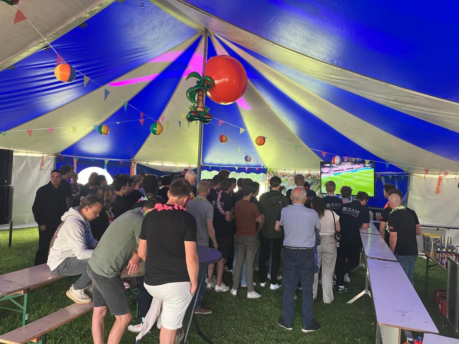 Op zondag werd de aftrap van het feest gegeven door Hegelsom 4, dat in Horst kampioen was geworden. Zij trapten de middag af met een uitzinnige viering, en daarmee werd meteen de toon gezet: dit zou een onvergetelijke dag worden. Langzaam stroomde de tent vol met teams en supporters. Op het grote scherm werd gezamenlijk gekeken naar de ontknoping van de Eredivisie, maar de échte kampioenen kwamen daarna pas binnen: Wittenhorst 3 én Wittenhorst 7! Ze werden feestelijk onthaald. Vanaf dat moment ging het dak er helemaal af.