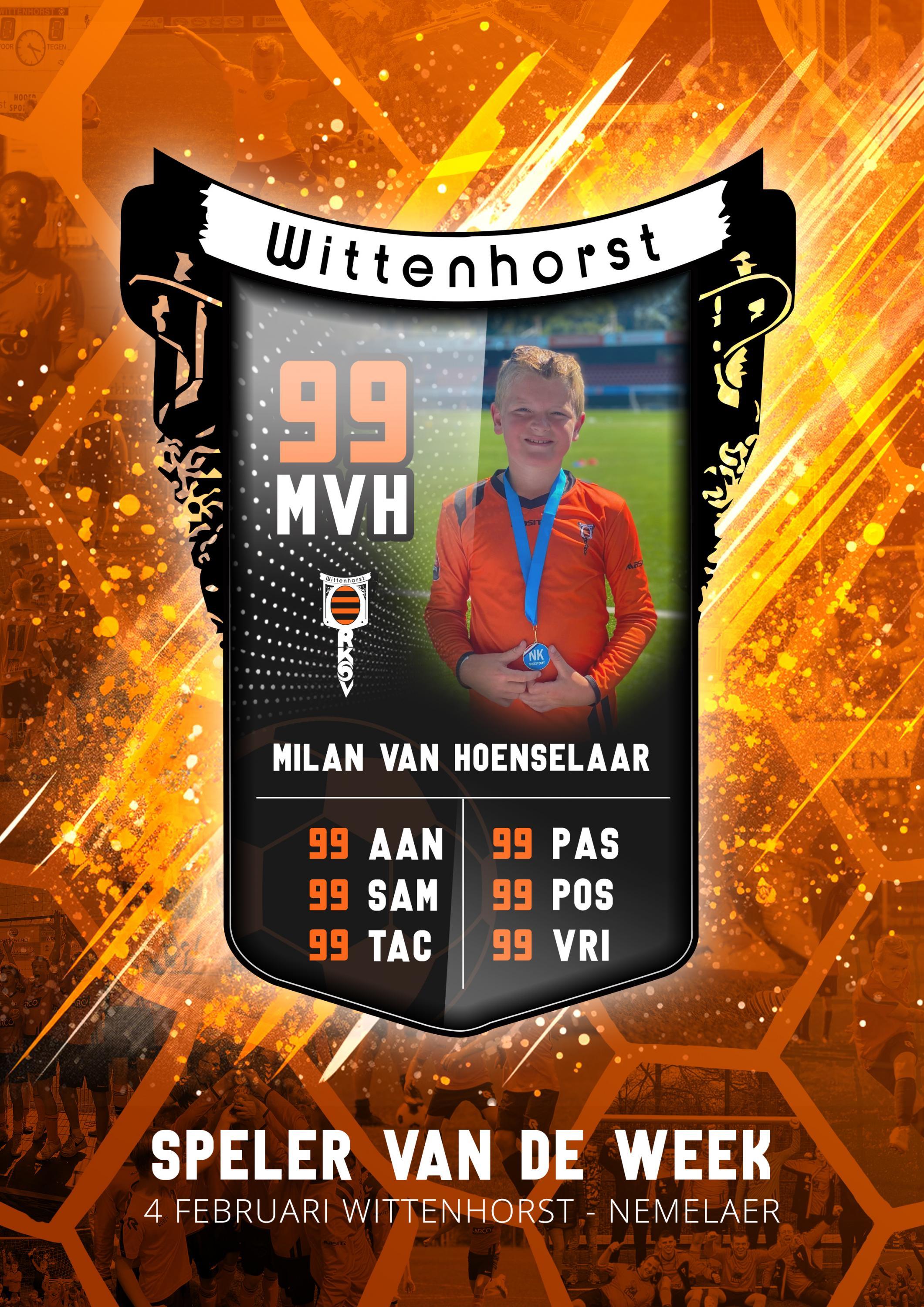Milan van Hoenselaar (JO10-1) en Michiel Freriks (JO10-1) zijn zondag 4 februari de spelers van de week bij Wittenhorst 1 tegen Nemelaer. Na het pak slaag afgelopen zondag kan Wittenhorst de punten goed gebruiken. Moedig onze jongens daarom flink aan heren!