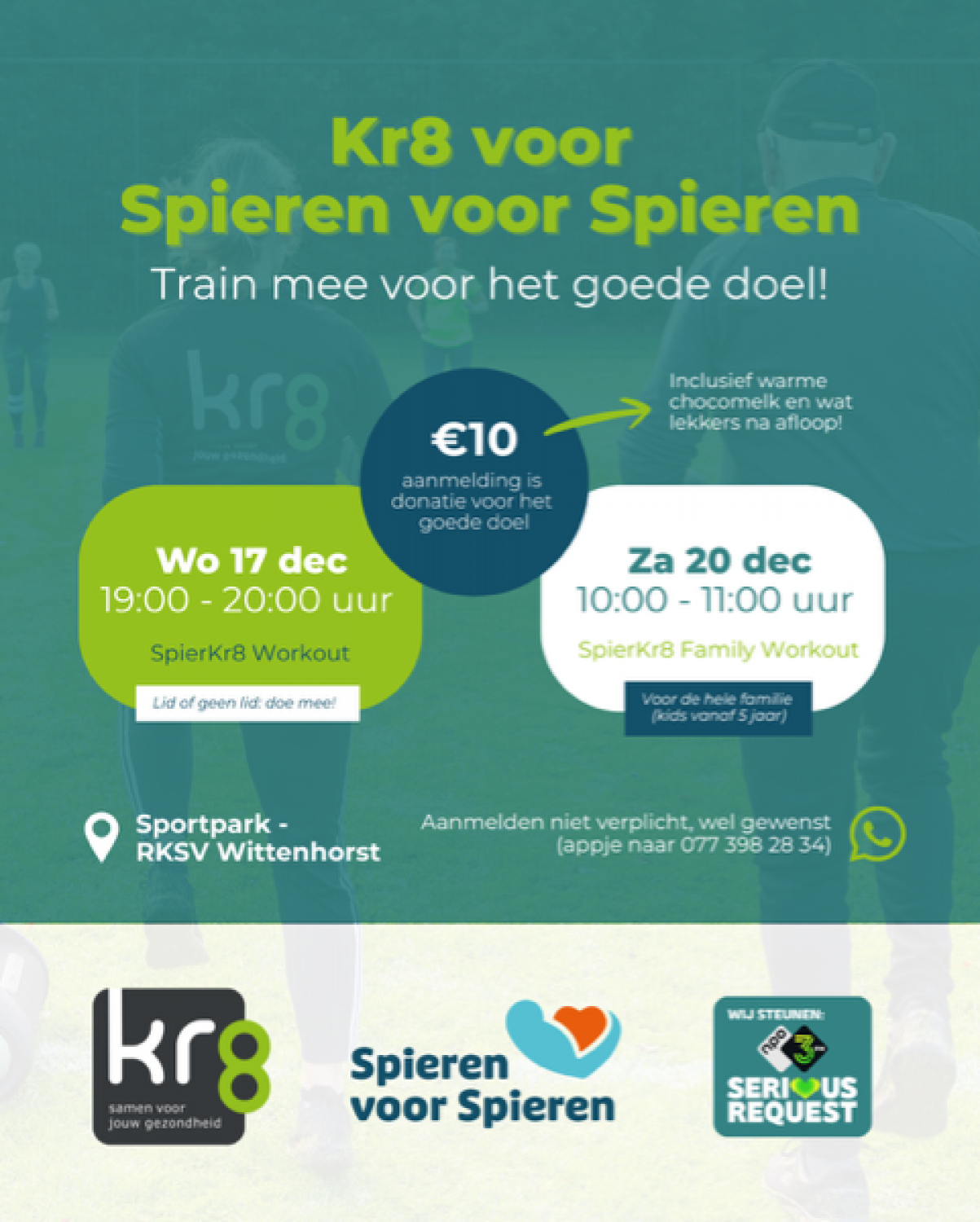 Op woensdag 17 december en zaterdag 20 december organiseert Kr8 op ons sportpark twee bijzondere workouts voor het goede doel: Spieren voor Spieren. Deze actie maakt deel uit van 3FM Serious Request en zet zich in voor kinderen die dagelijks vechten tegen spierziekten.