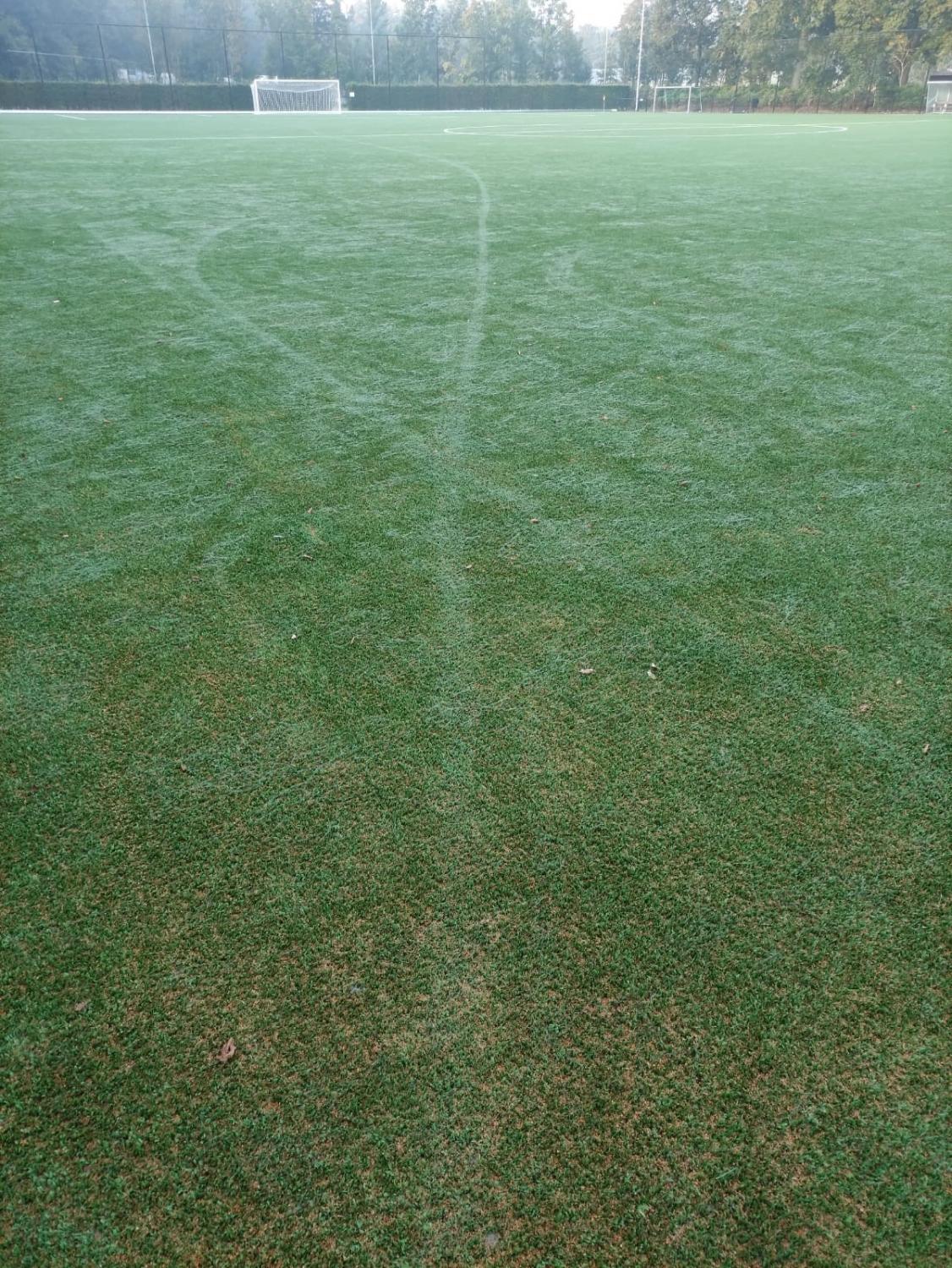 Afgelopen weekeinde heeft er iemand met een bromfiets over een van de pas gerenoveerde kunstgrasvelden gereden.