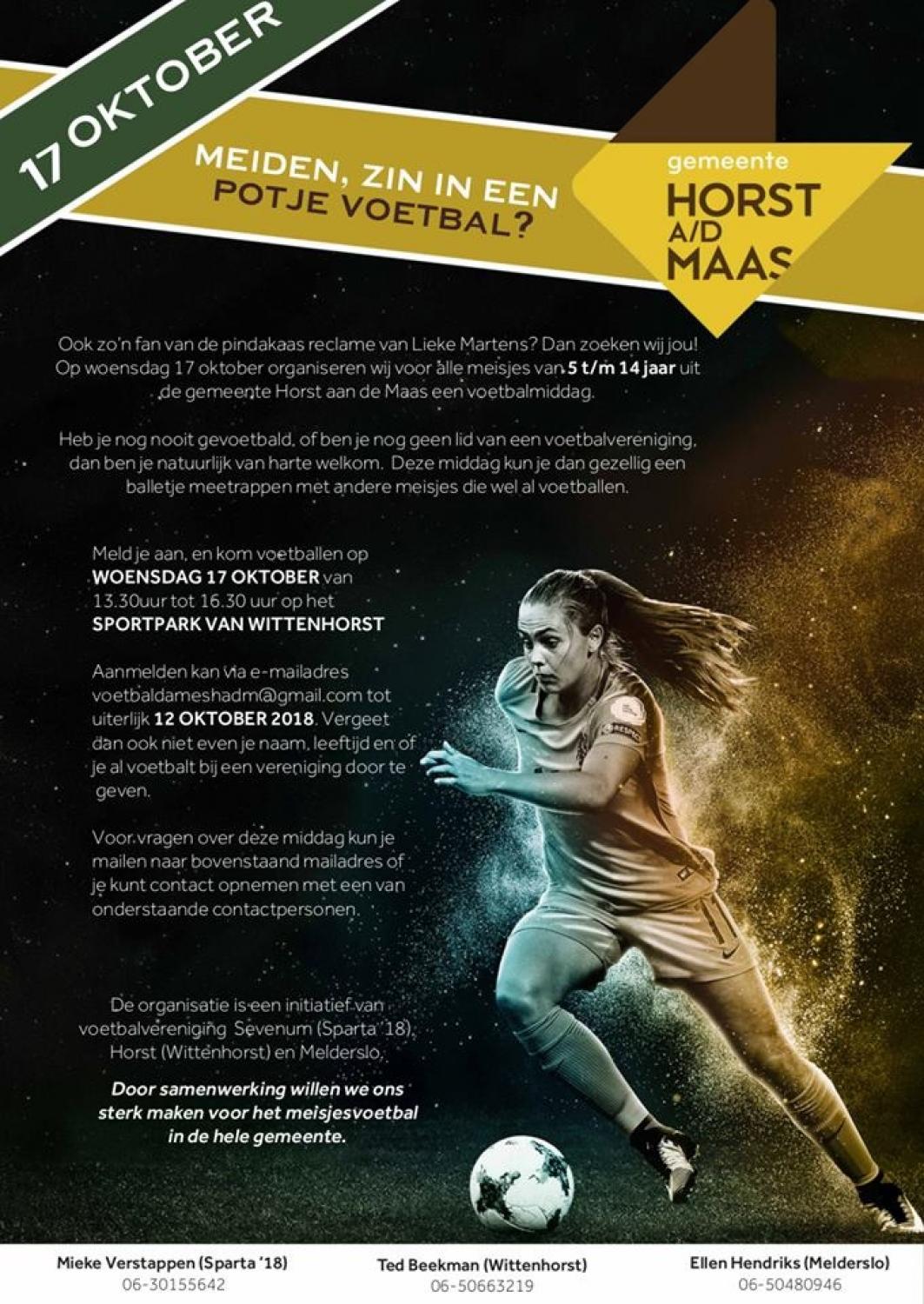 Op woensdagmiddag 17 oktober wordt op het sportpark van Wittenhorst een voetbalmiddag voor meisjes in de leeftijd van 5 tot en met 14 jaar gehouden. Ervaring of geen ervaring, talent of geen talent: het maakt allemaal niet uit. De voetbalmiddag is bedoeld voor iedereen die het leuk lijkt om een balletje te trappen.